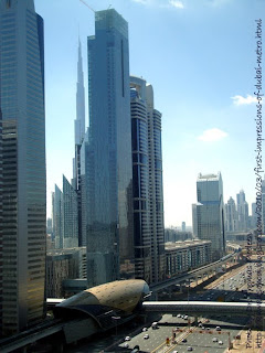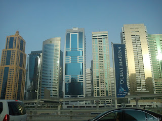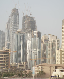 W tle najwyższy budynek świata Burj Dubai. A poniżej w budowie kolejny sen wariata: budynek którego dach jest przekręcony o 90 stopni w stosunku do ziemi.... I te dźwigi na dachach. Ściągają je helikopterem??? Podobno 15% dźwigów na świecie zlokalizowanych jest właśnie w Dubaju. Nie wiem - nie liczyłam, ale jestem w stanie uwierzyć.