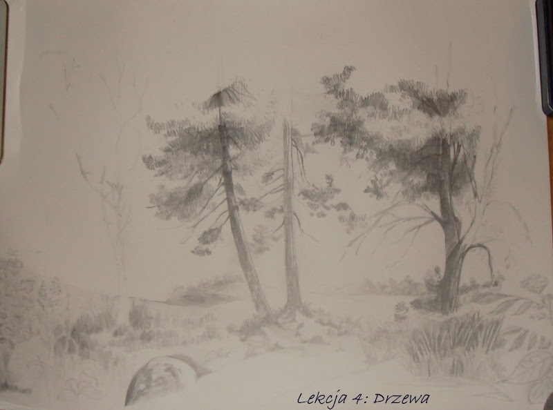 Jak widać nie skończone. Ale to bardziej z braku czasu i zachwytu dotychczasowym wynikiem. Tak mi się podoba to co mam że kompletnie nie czuję popędu do skończenia. Patrzę na tę planszę i nie mogę uwierzyć że to co mnie zachwyca sama zrobiłam. Ok, przyznaję że góry drzew to kreska prowadzącego (te wielkie grubasińskie igły i liście na obu drzewach) ale to co mi się podoba znajduje się na pniach i pod drzewami oraz daleko na horyzoncie: krzaczki.